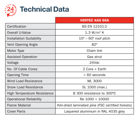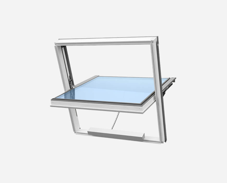The Ventec KAS S6A central pivoting window, with built in 24Vdc actuator, opens up to 82º to vent excess smoke and heat during a fire. Also suitable for daily use ventilation.